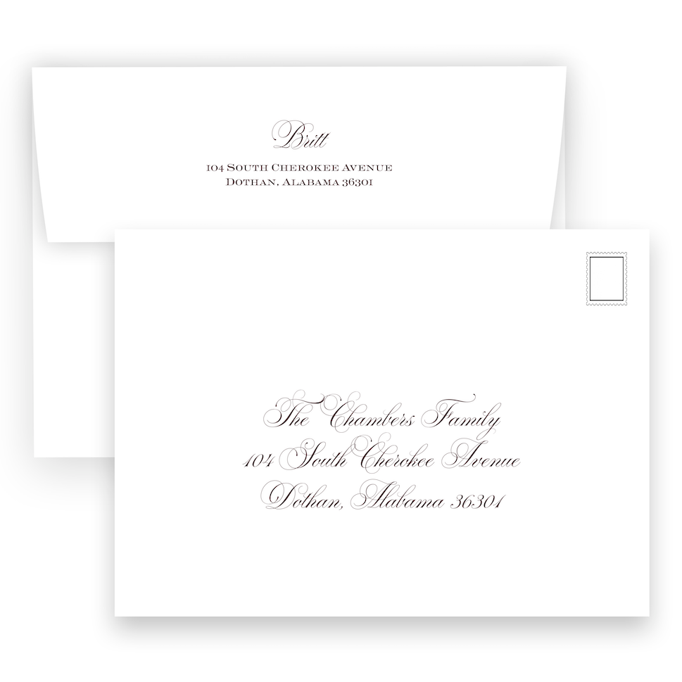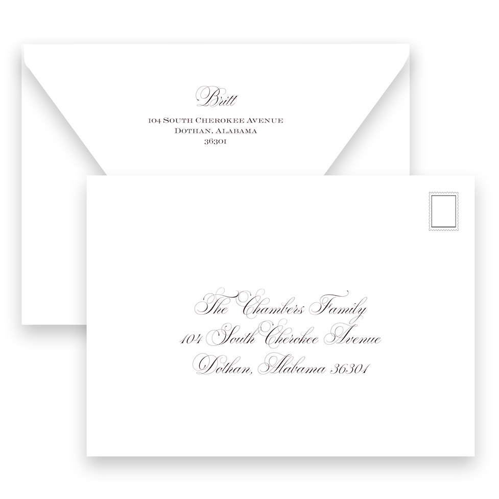 • Envelopes are included with your purchase and will match the paper of your printed product; euro flap envelopes, coordinating liners, gift tags, return and front addressing are available for purchase