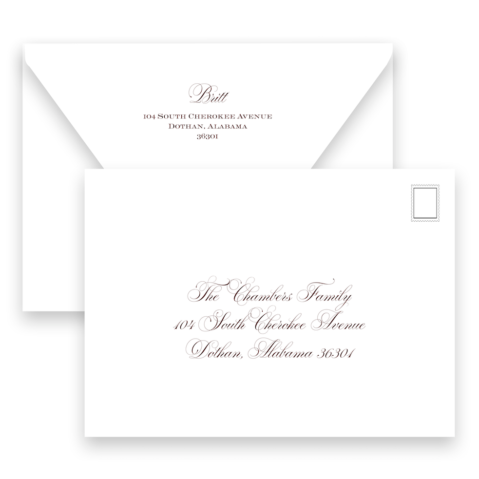 • Envelopes are included with your purchase and will match the paper of your printed product; euro flap envelopes, coordinating liners, gift tags, return and front addressing are available for purchase