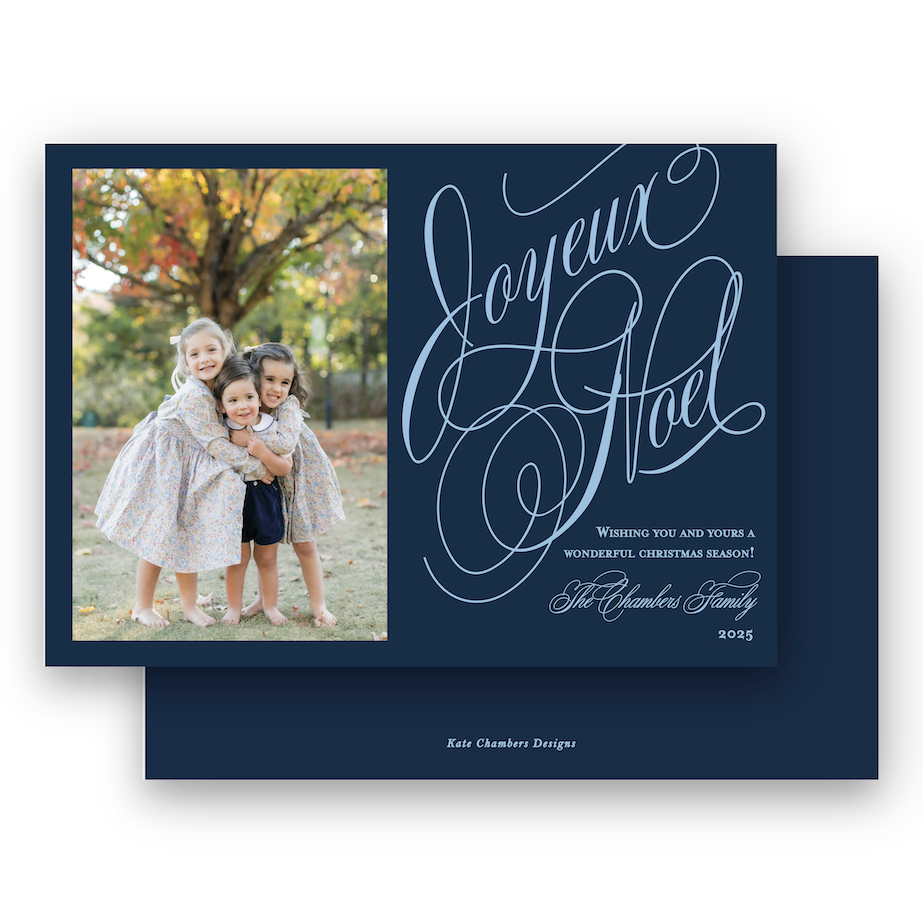 Navy and Blue Slanted Script "Joyeux Noel" Landscape Holiday Card