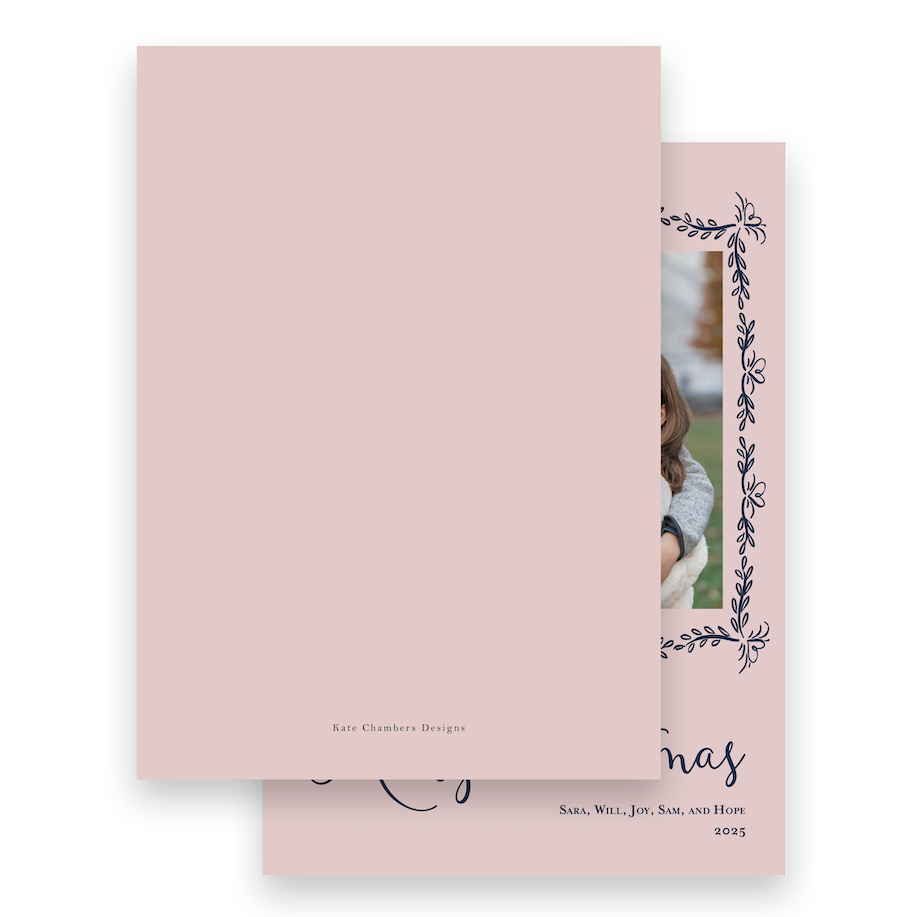 Blush Pink with Navy Floral Border Portrait Holiday Card