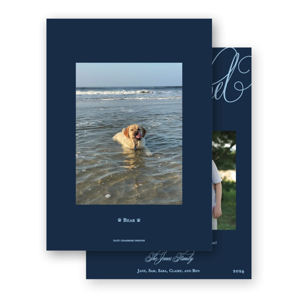 Navy and Blue Script "Joyeux Noel" Portrait Holiday Card