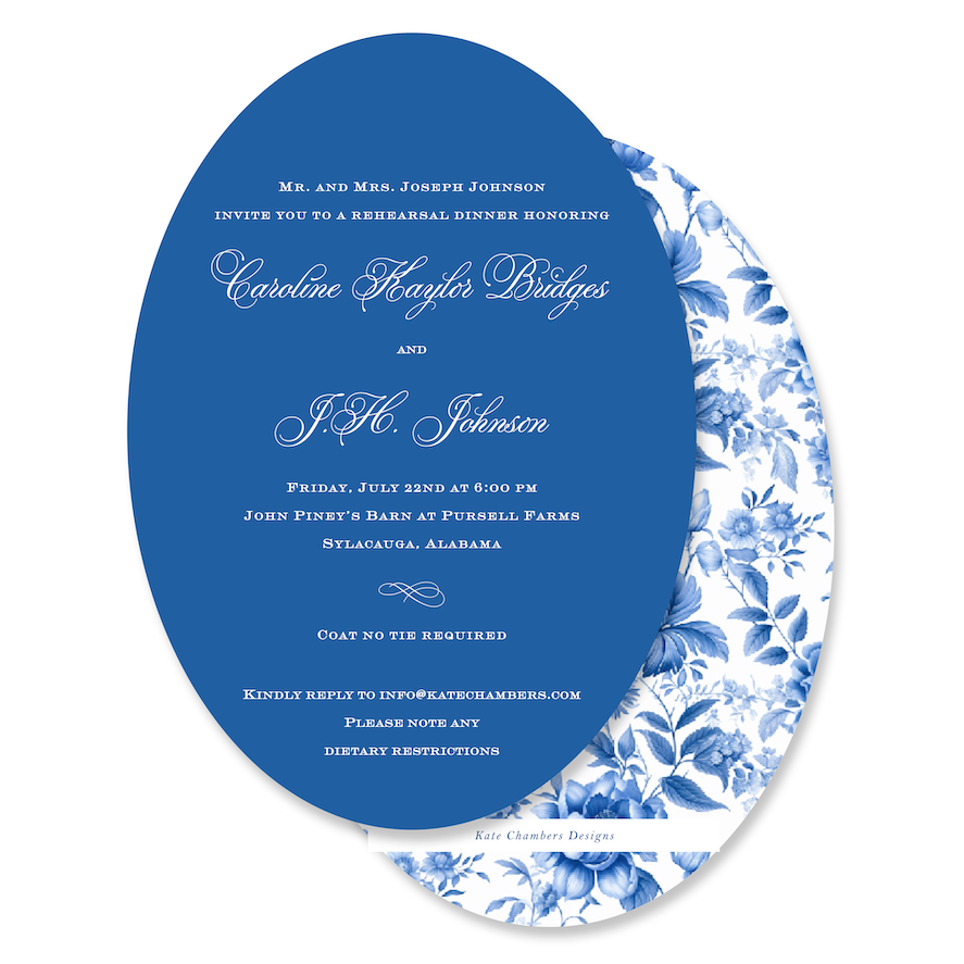Classic Blue with Rose Floral Print Oval Rehearsal Dinner Invitation