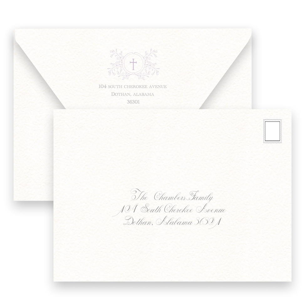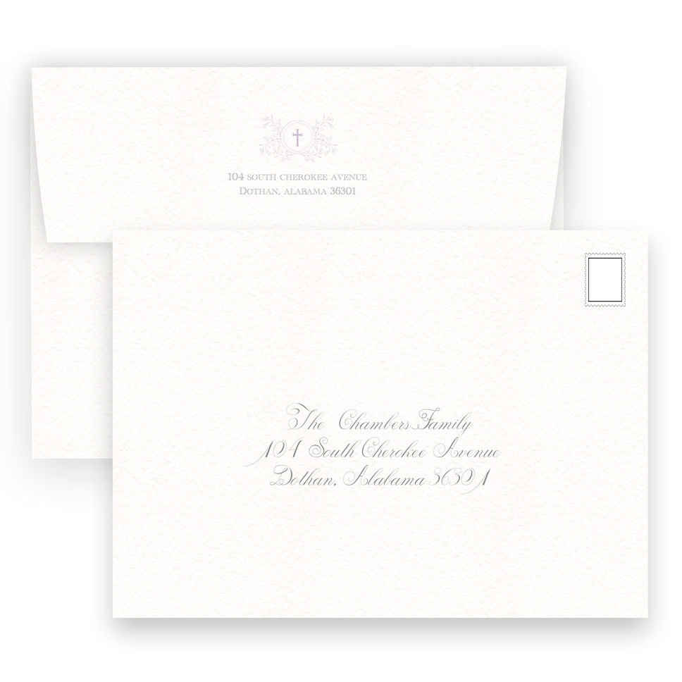 Lilac Crest with Cross Baptism Invitation