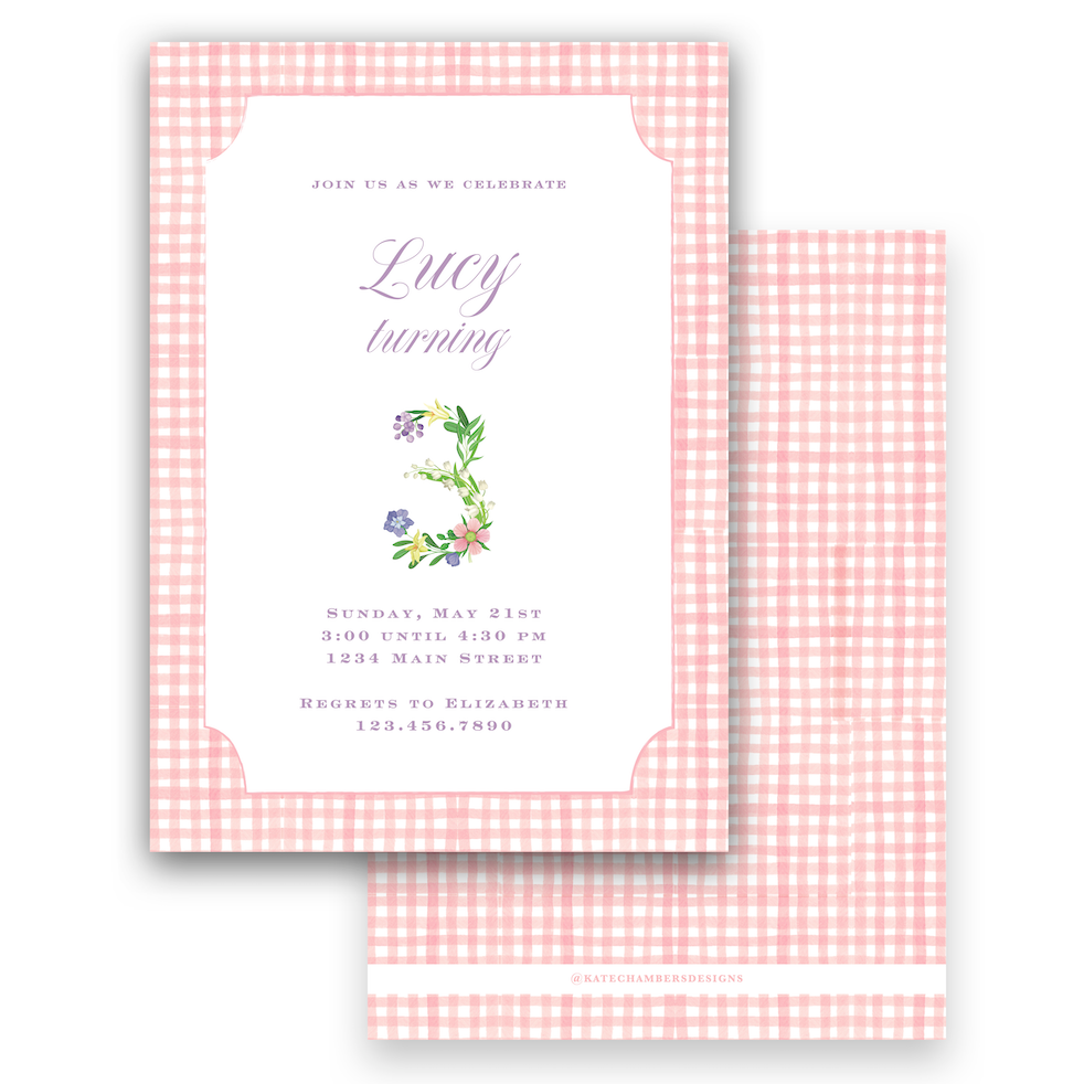 Watercolor Full Floral Purple Number with Gingham Border Birthday Party Invitation