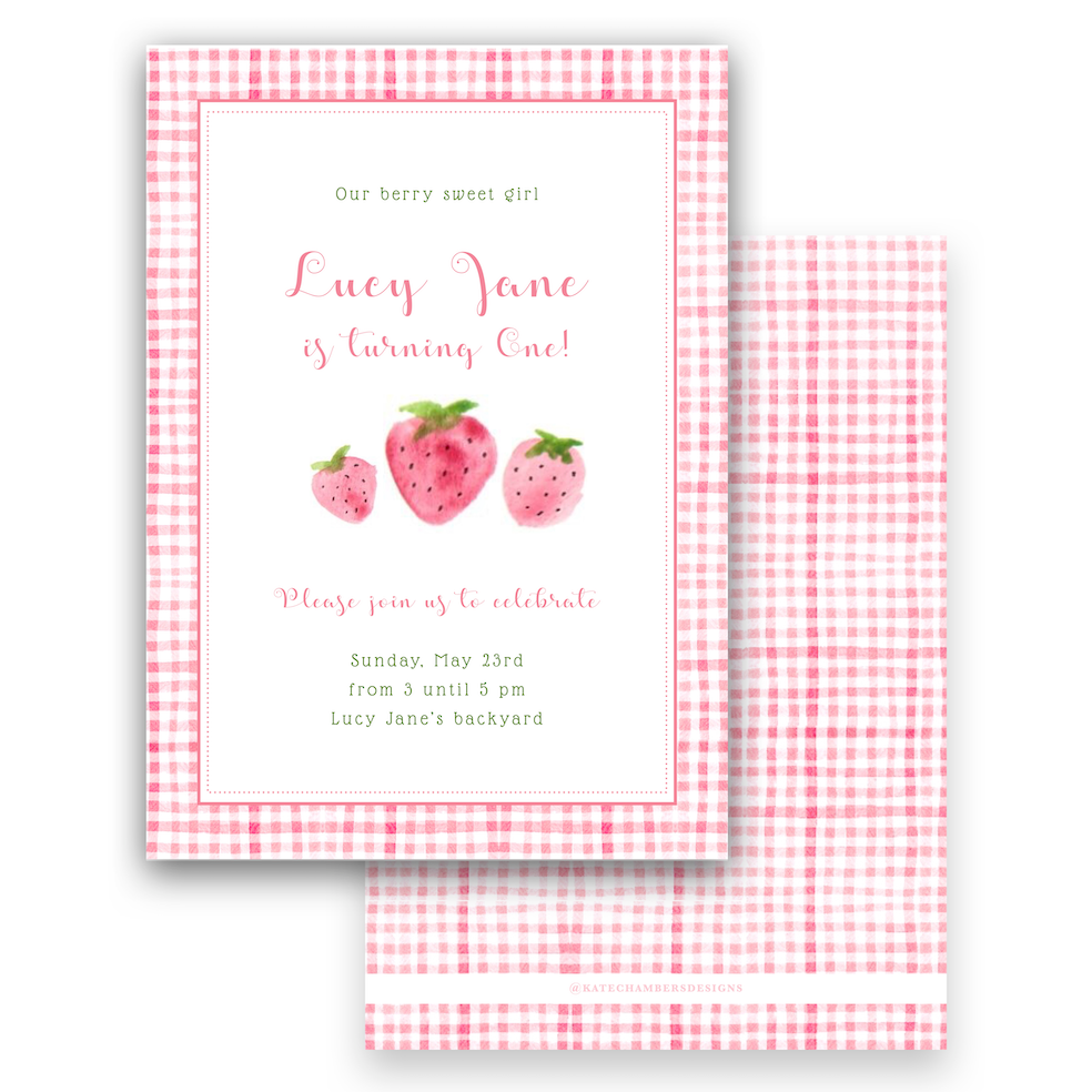 Watercolor Strawberry with Gingham Border Birthday Party Invitation