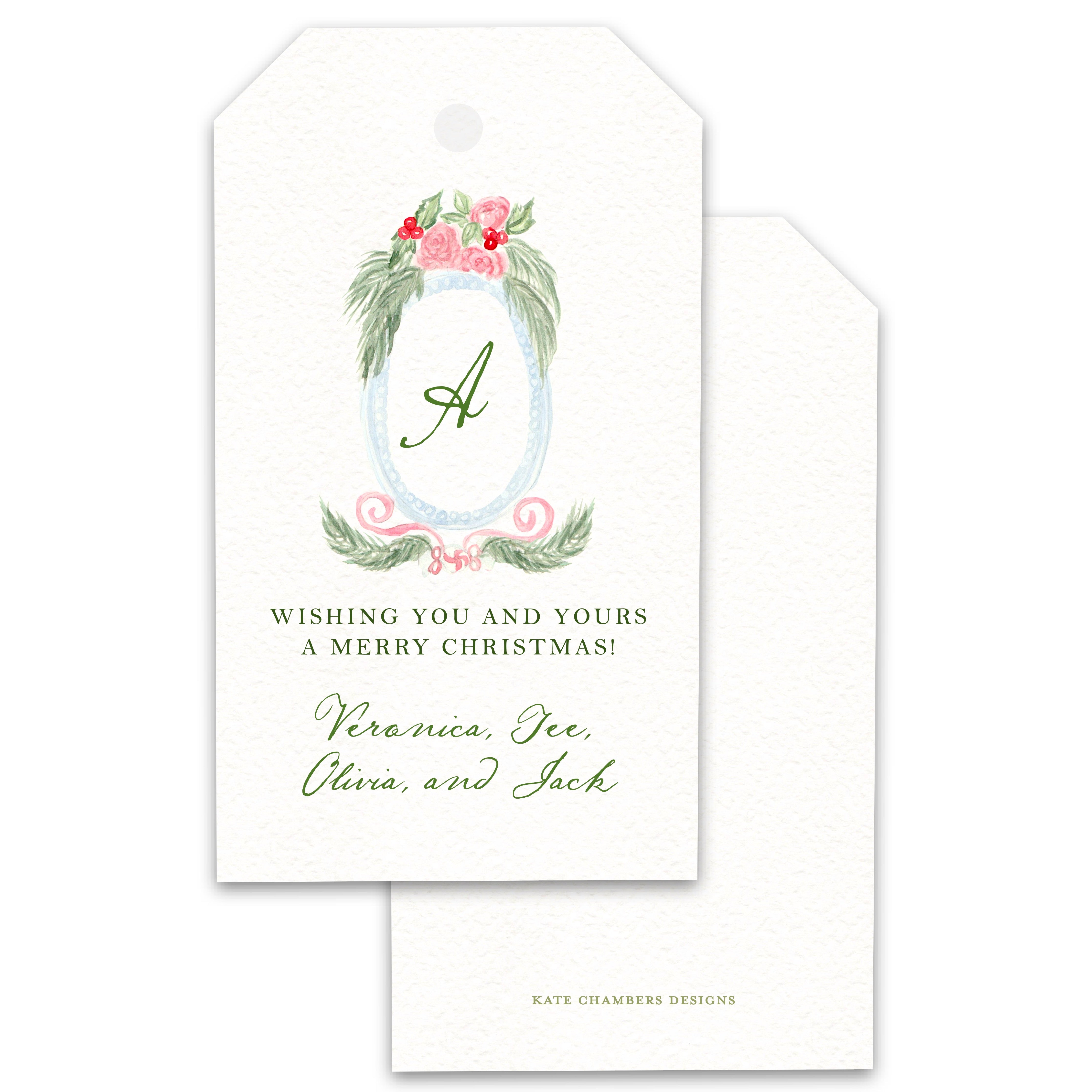 Watercolor Monogram Crest Red Pink Bow Holiday Gift Tag