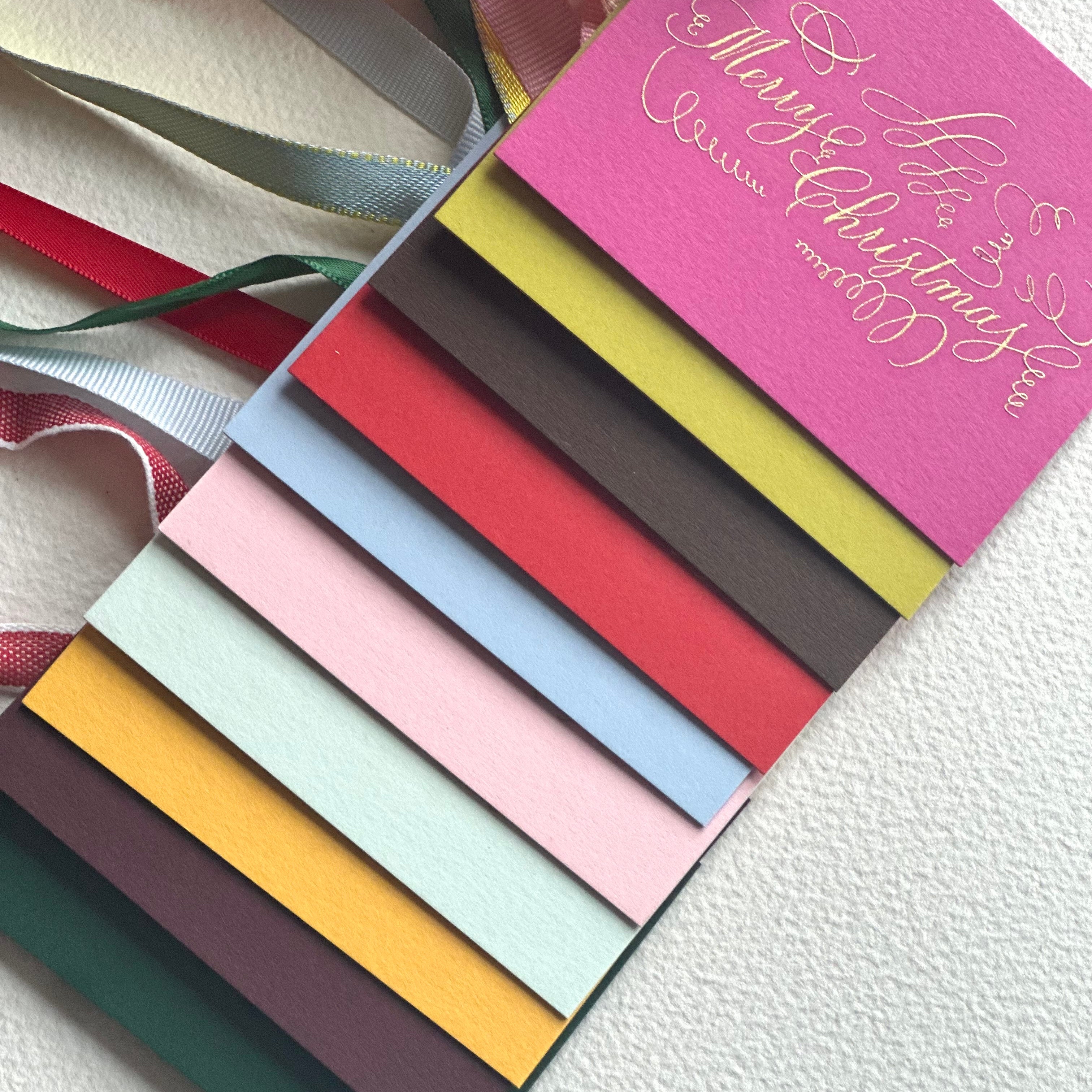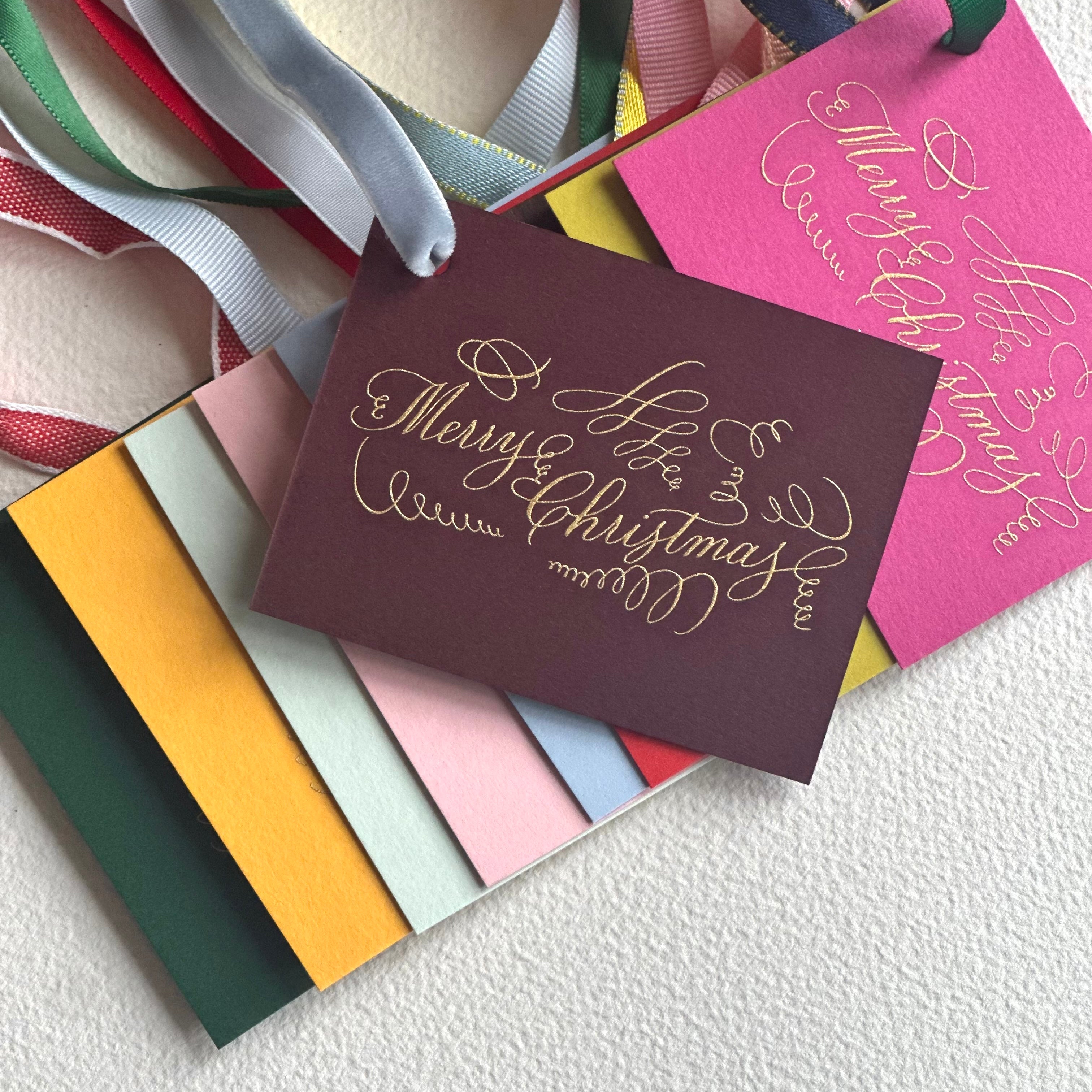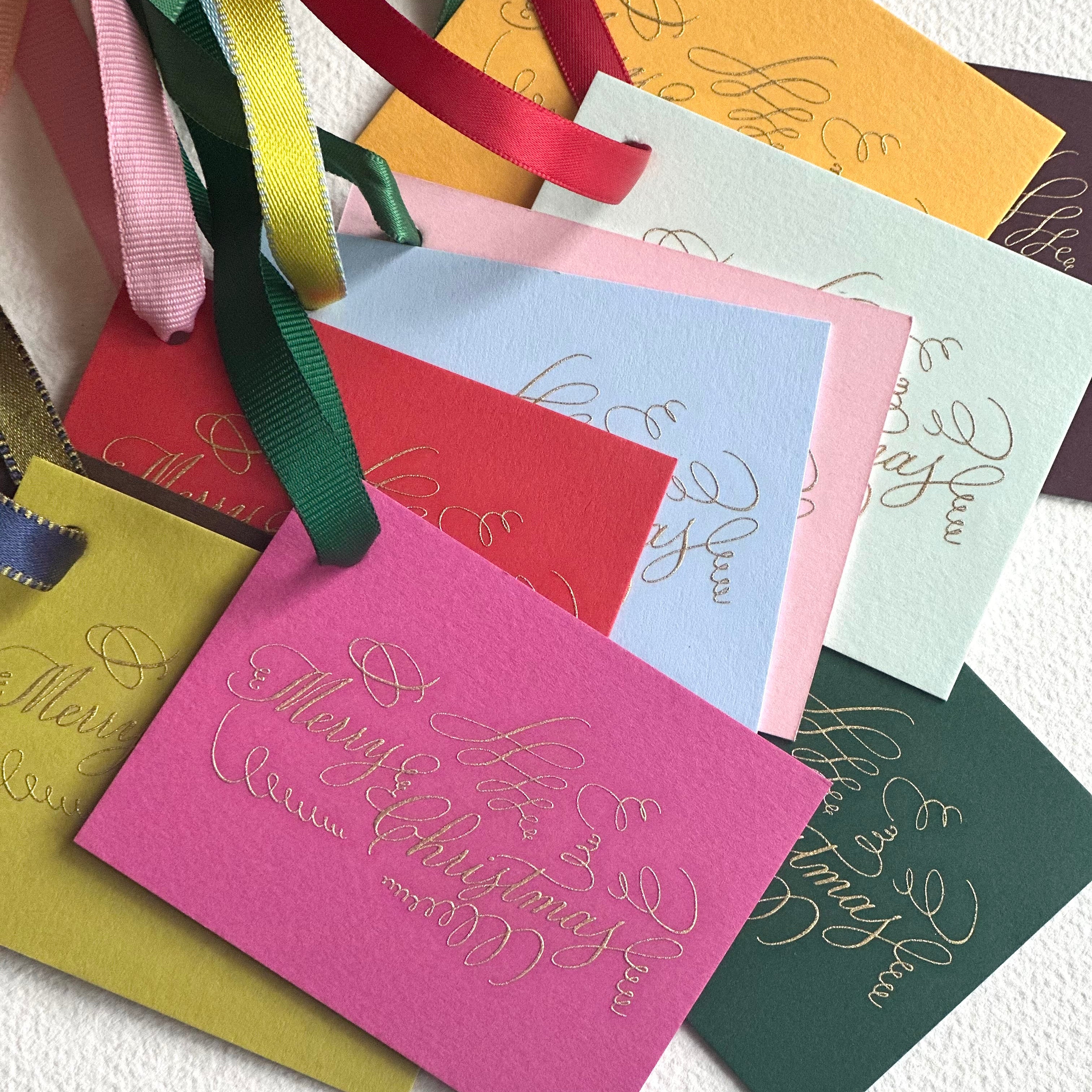 Custom Calligraphy Merry Christmas Engraved multi-colored card stock Gift Tags, Set of 10
