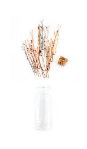 Mini sleek classic hair bobbies 18-pack packaged in a glass canister. Approximately 2" across.