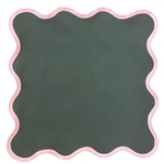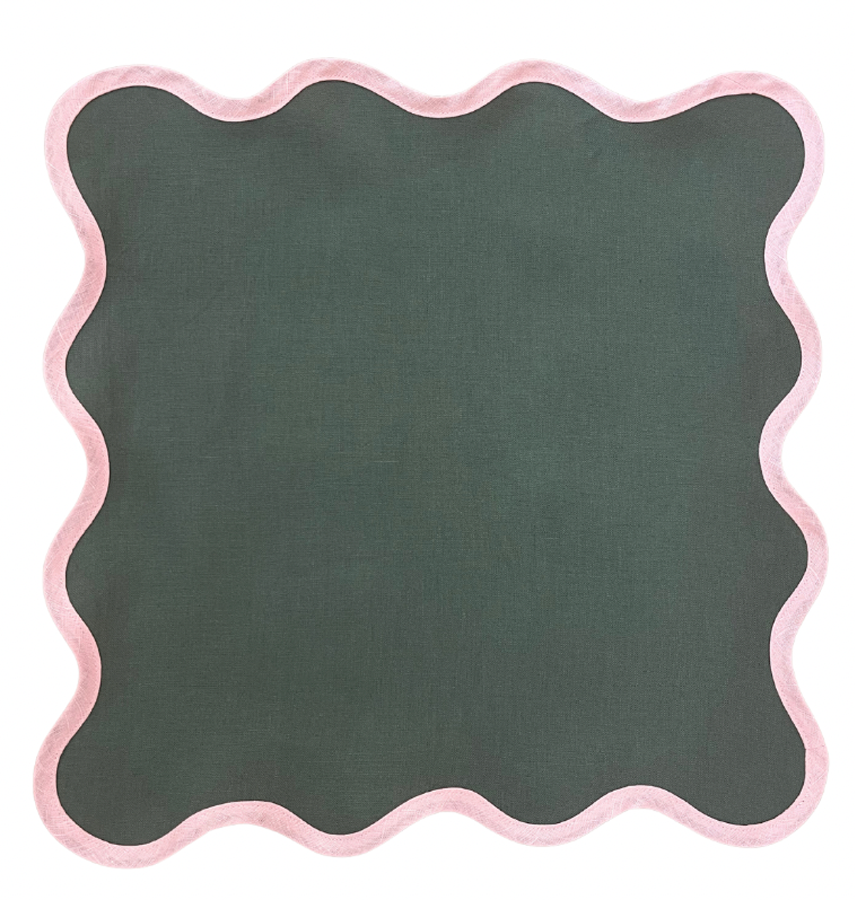 100% linen scalloped square in Pine Green with Peony Pink trim. 17” x 17" square Important Care Instructions: Pre-treat stains. Machine wash cold separately on gentle cycle. Lay flat to dry. Iron on cotton / linen setting. NOTE: Linen products can be professionally laundered.