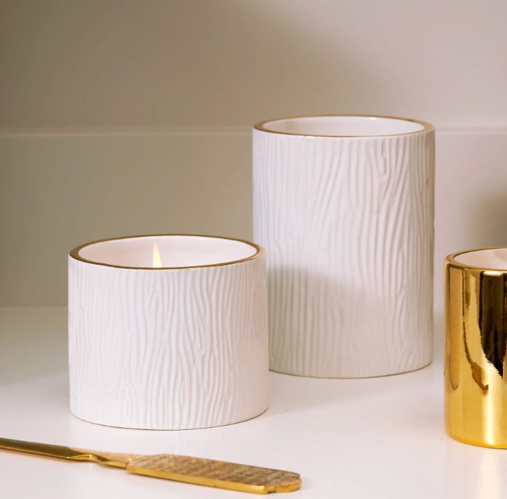 This aromatic candle features stunning wintery white wood grain ceramic, trimmed with 24-karat gold rim, filling the room with the iconic mountain fresh fragrance.
