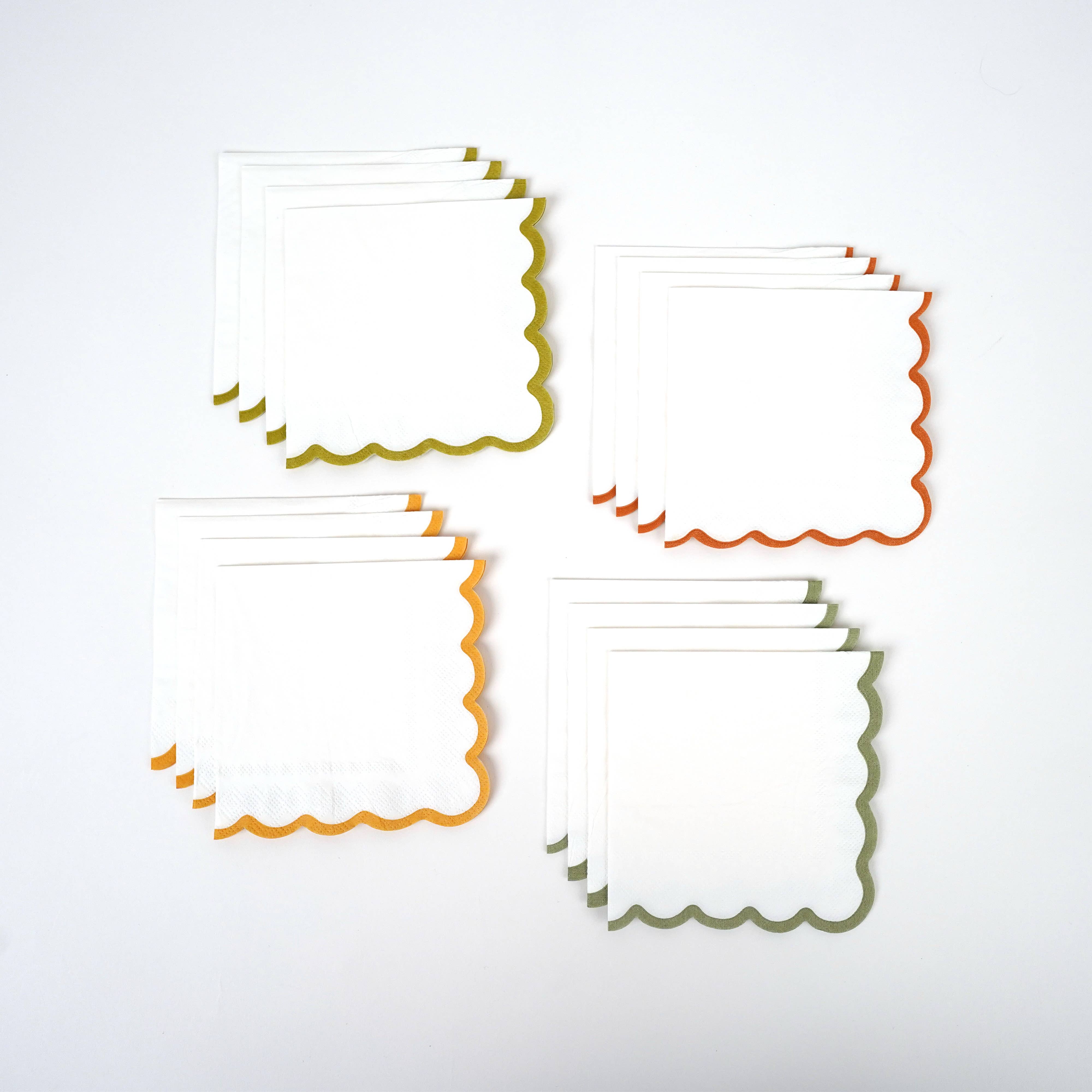 Hosting an autumn feast? Add some fun to your table with these Scallop Cocktail Napkins! Their colorful scalloped edges – bright oranges, fiery reds, and earthy olives and greens – are perfect for adding a cozy touch of fall flavor to your dinner parties. Adding color to a dull table top was our focus when customizing our beverage napkins. We have customized our napkins with stunning colors and designs that would add an appealing touch to any table top decor. Pack of 16 Measures 5" Made from paper Made in China
