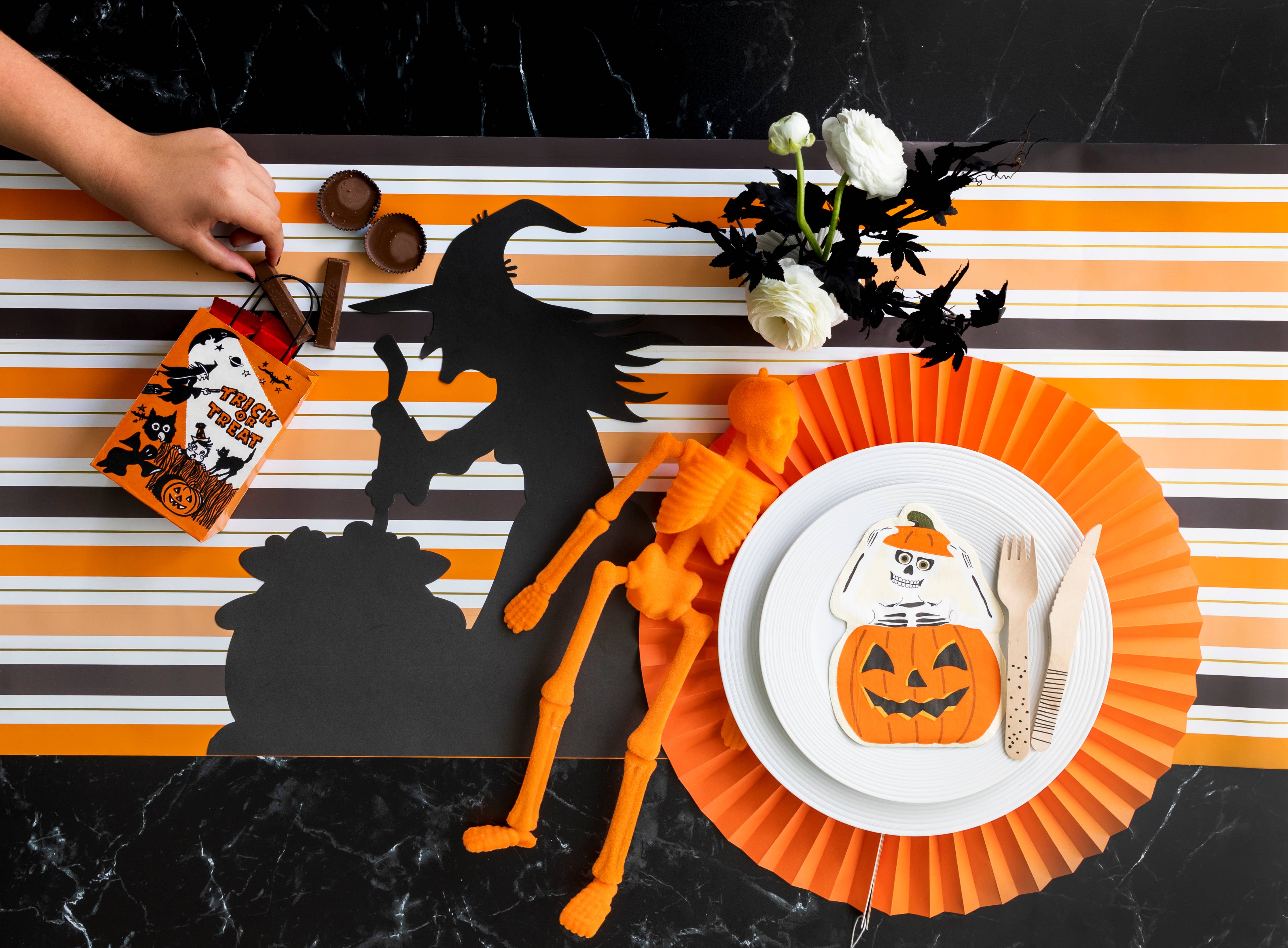 Make your table erie and excitingly spooky for halloween with these die-cut skeleton in pumpkin napkins! Perfect addition for a ghoulishness celebration, making it a lasting impression! Designed to be one of a kind, our die-cut napkins are the best addition to any fun table top. These napkins are well-designed to make a prominent appearance and are 100% recyclable. Pack of 16 Measures 7" Made from paper Made in China