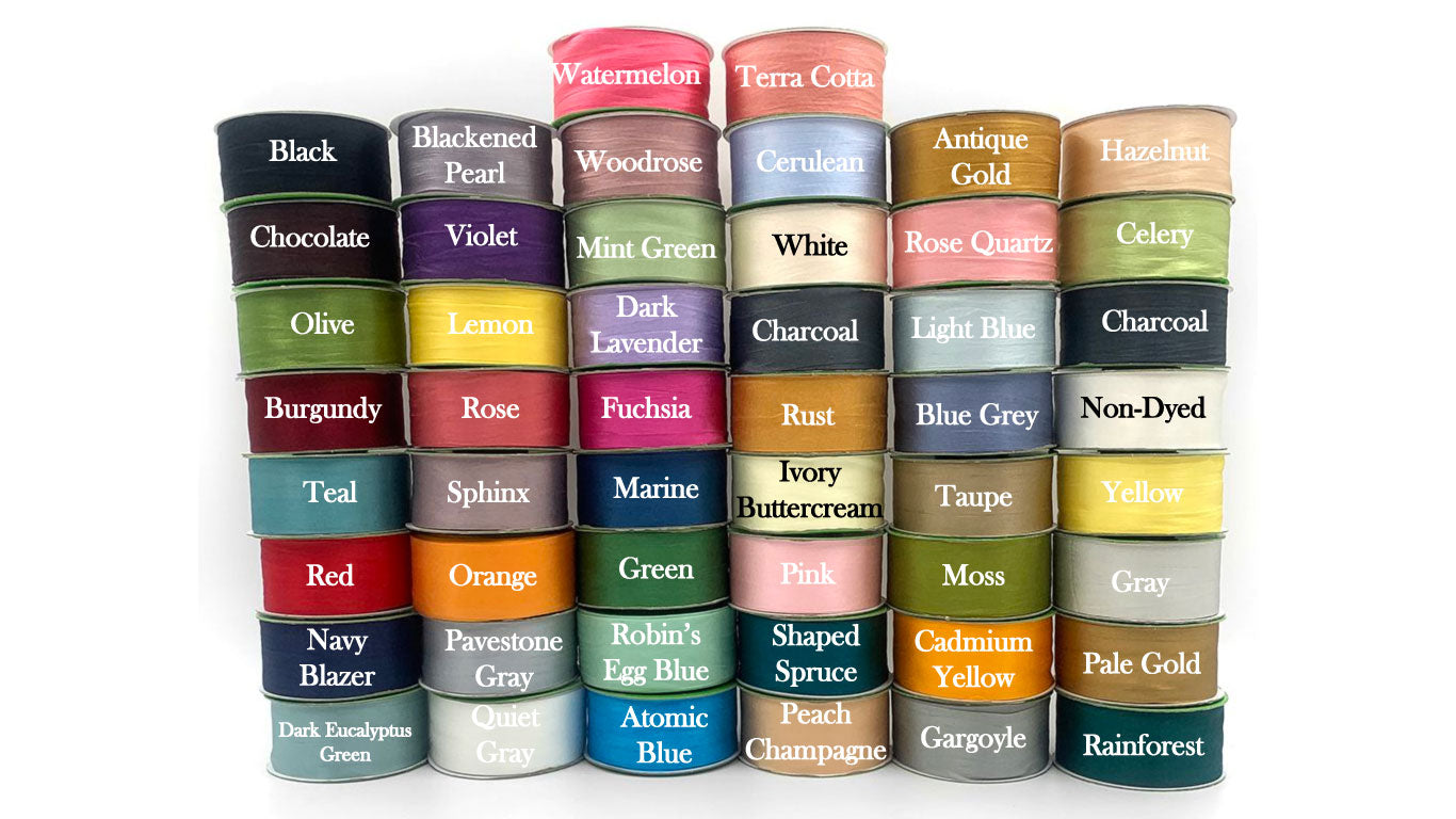 Please take note that due to the hand-dyed nature of the silk ribbons, color can and does vary between batches. Each ribbon is dyed to a corresponding Pantone textile code inspiration (Pantone textile codes are different than the PMS for printing on ink and paper), but due to the nature of the organic fabric environmental factors can affect the dyeing process in different ways.