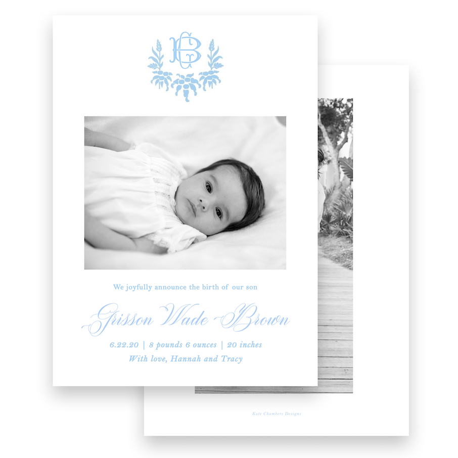Boy's Blue Palm Monogram Wreath Birth Announcement